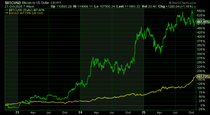 However, Bitcoin has outperformed gold over the last 1-, 3-, 5- and 10-year periods.